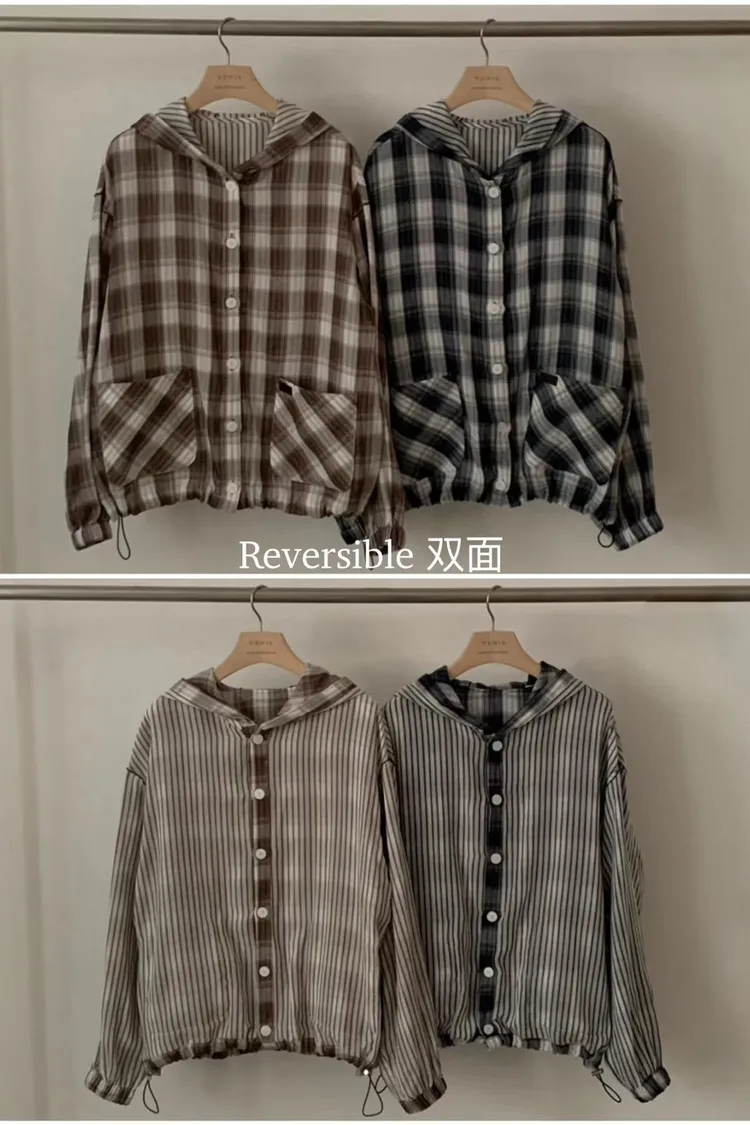 AA252蝦味仙寶寶紗兩面穿格紋線條連帽外套