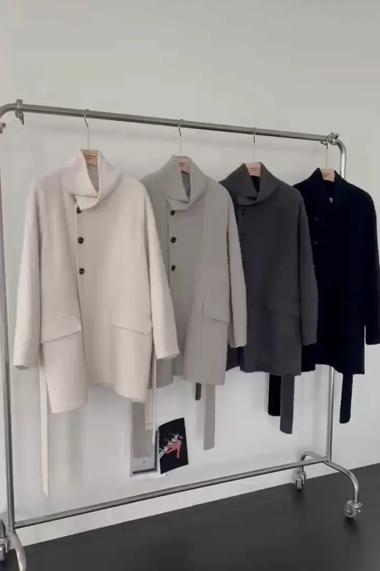 EE237-grey家三釦綁帶中長手工外套