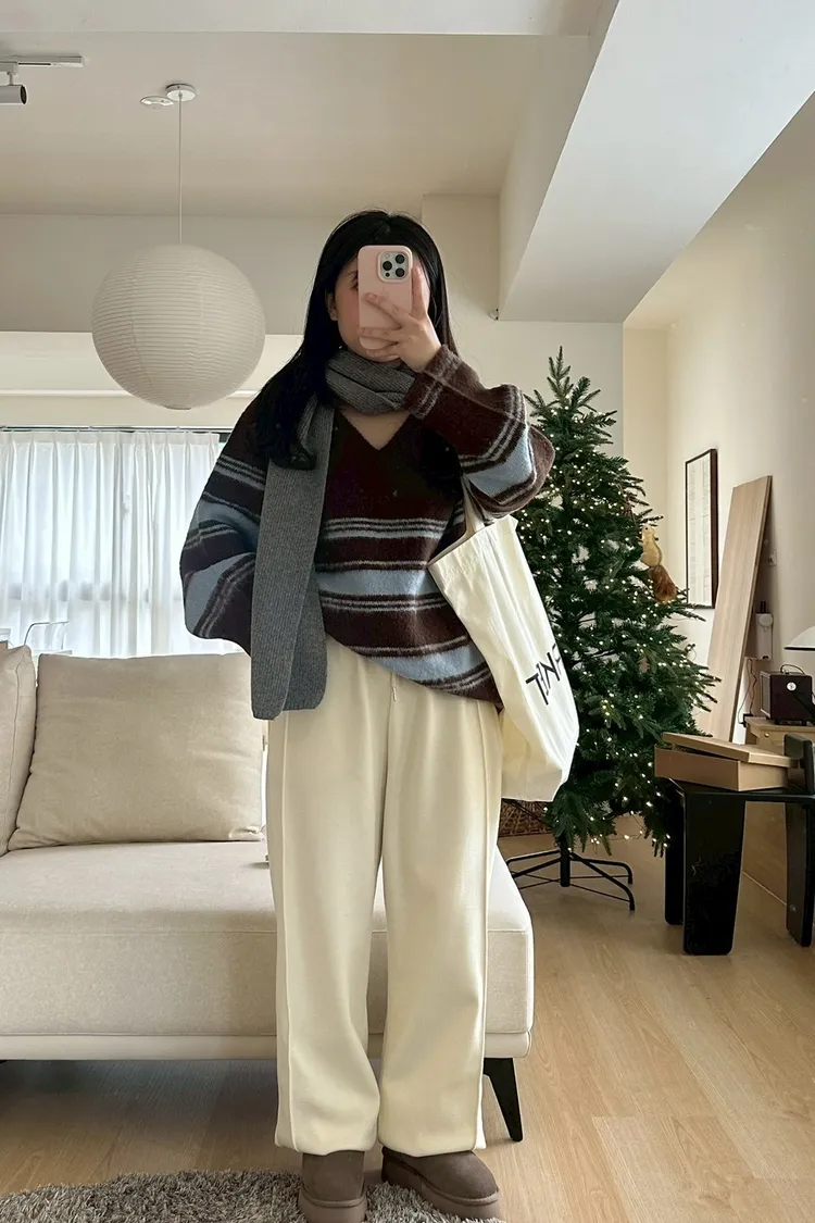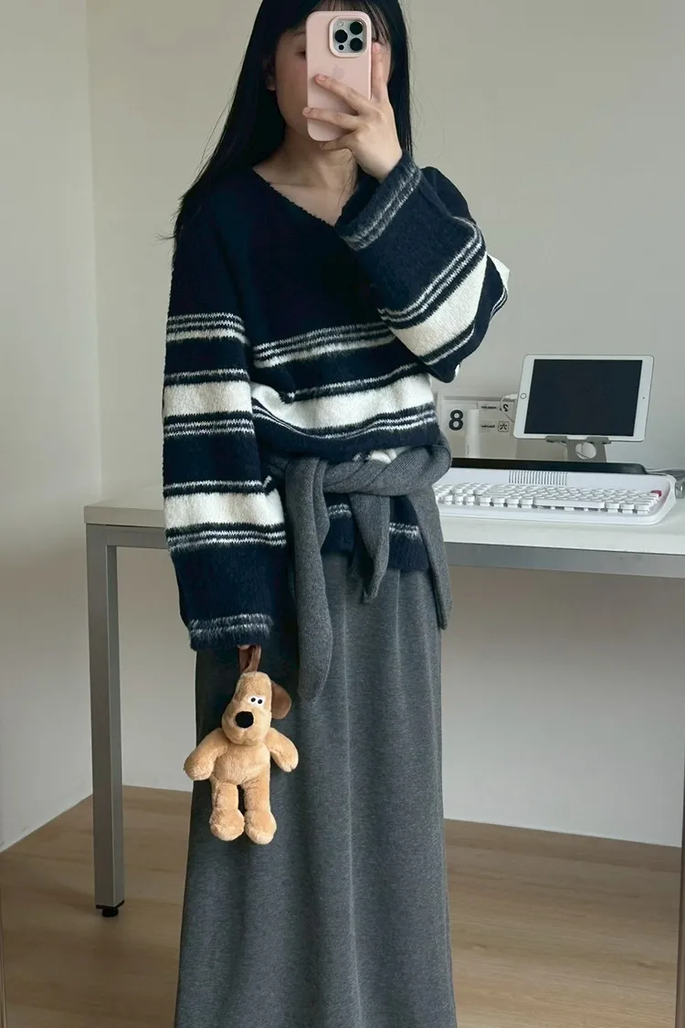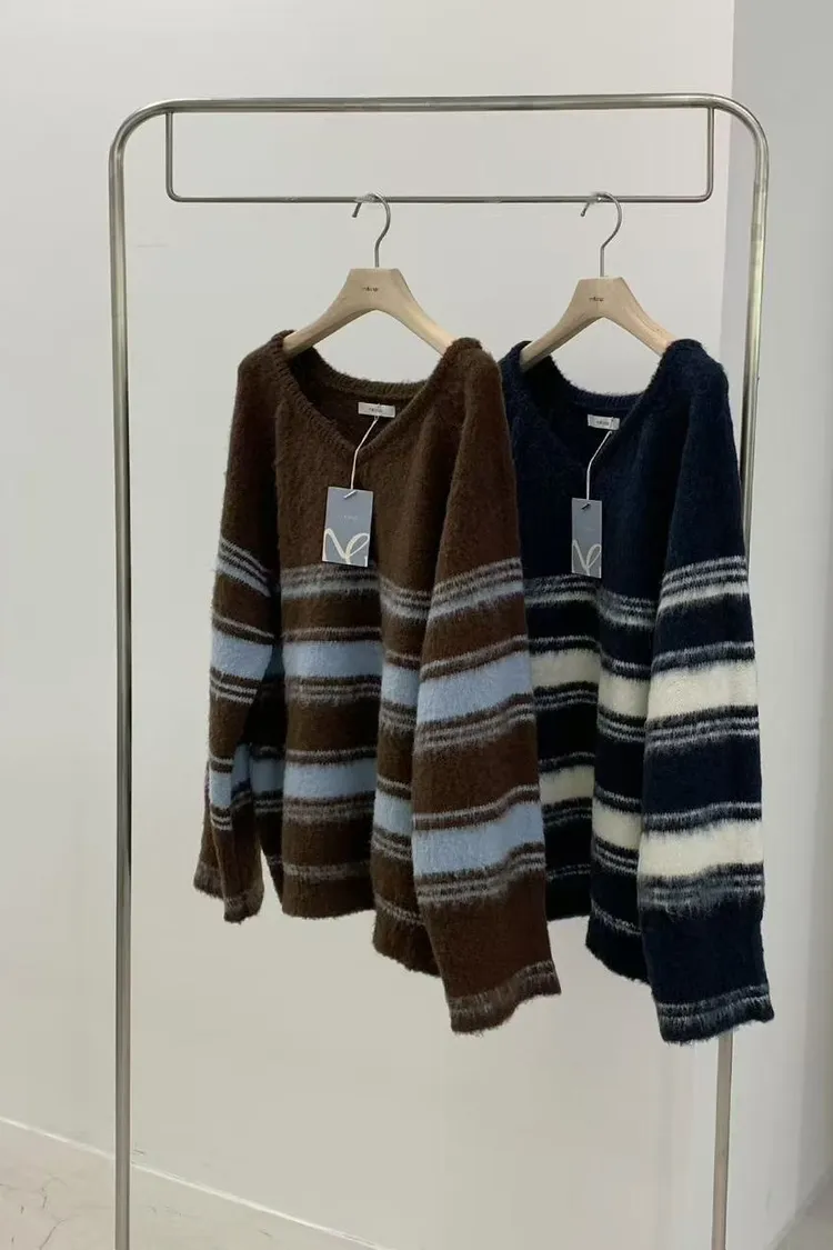 EE353冬季慵懶~mellounge條紋V領寬鬆毛衣(看大面積喊單)