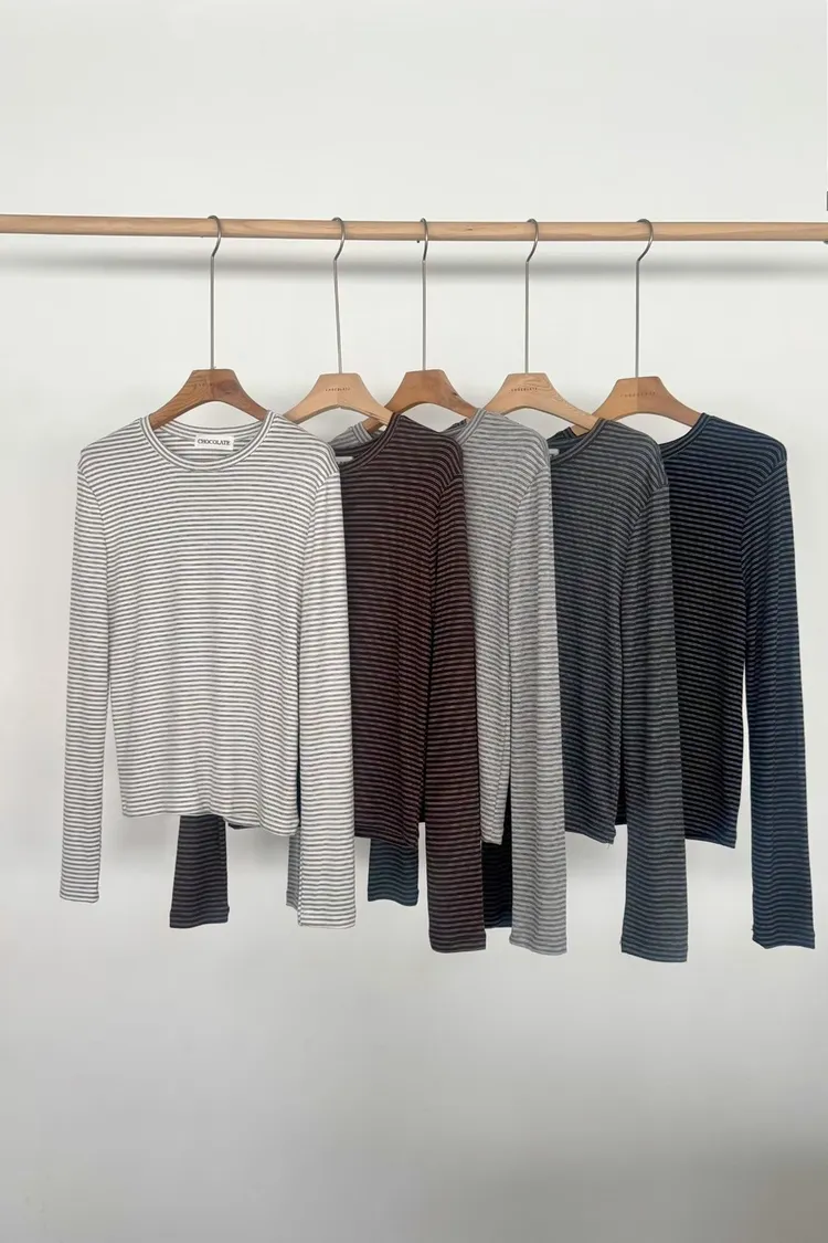 HH317六色合身不緊身巧克力條紋上衣