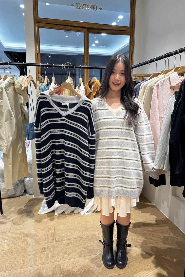 SS168-OVERTAKE小V領微翻領條紋毛衣