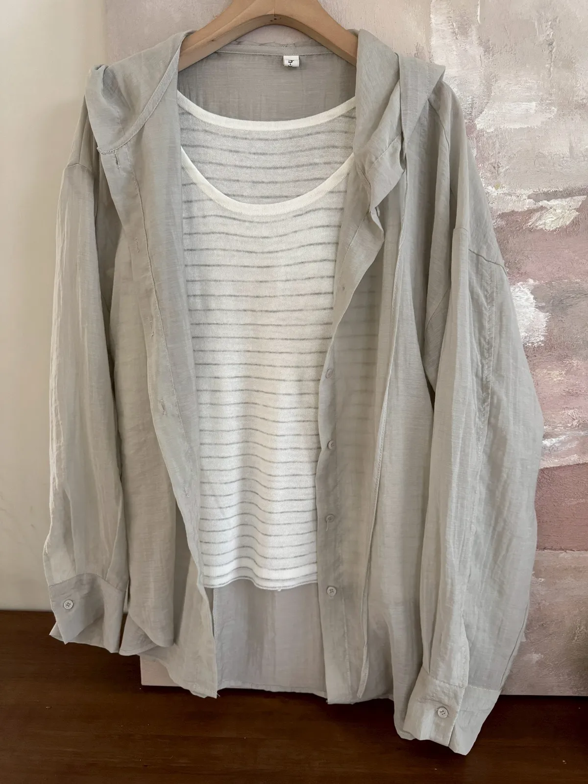 TT556買到賺到1+1組合連帽抽繩排釦襯衫配條紋背心